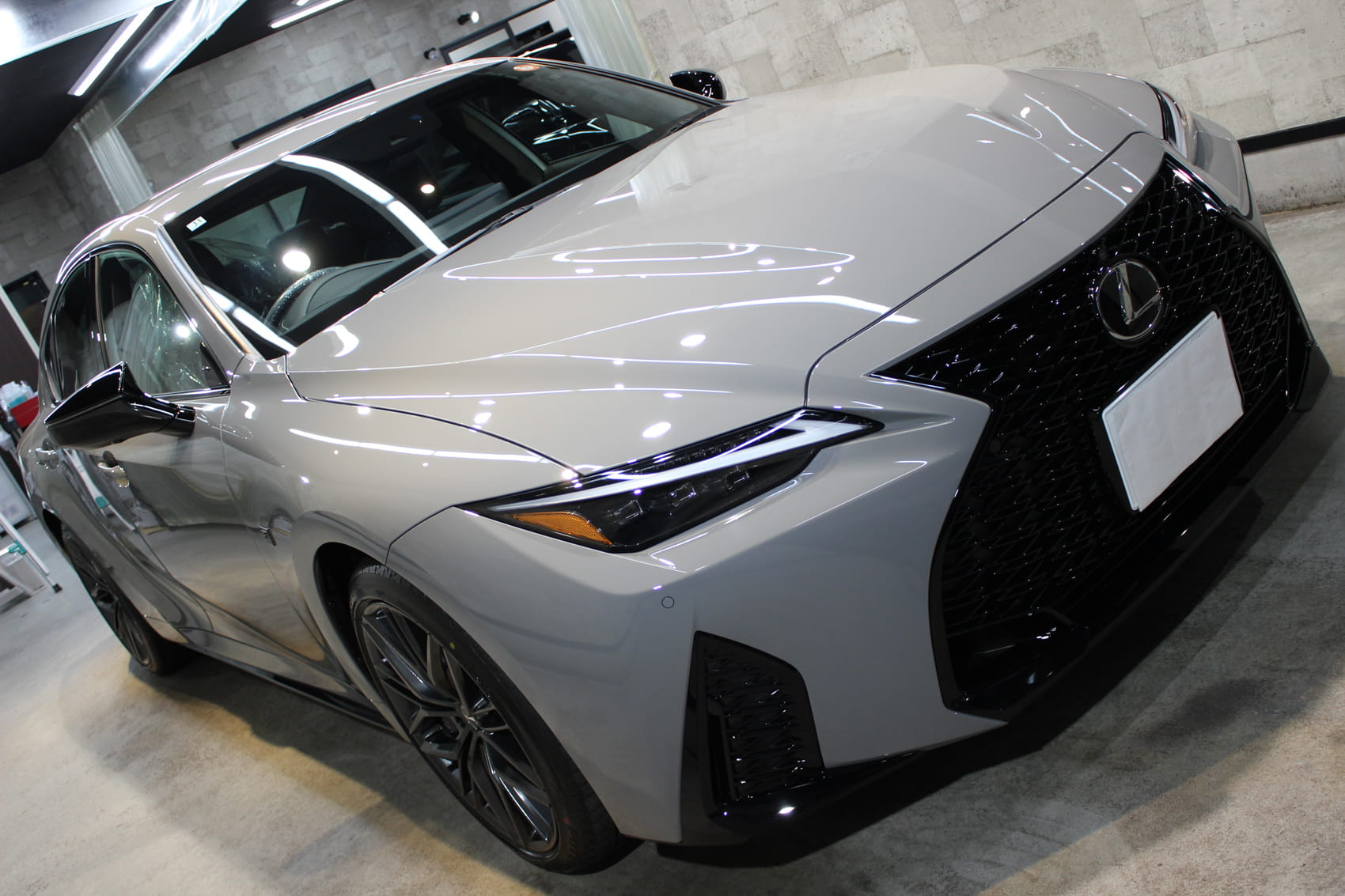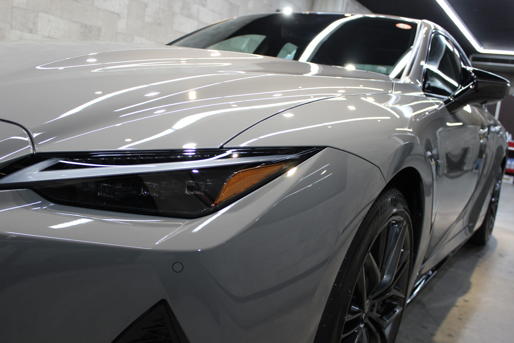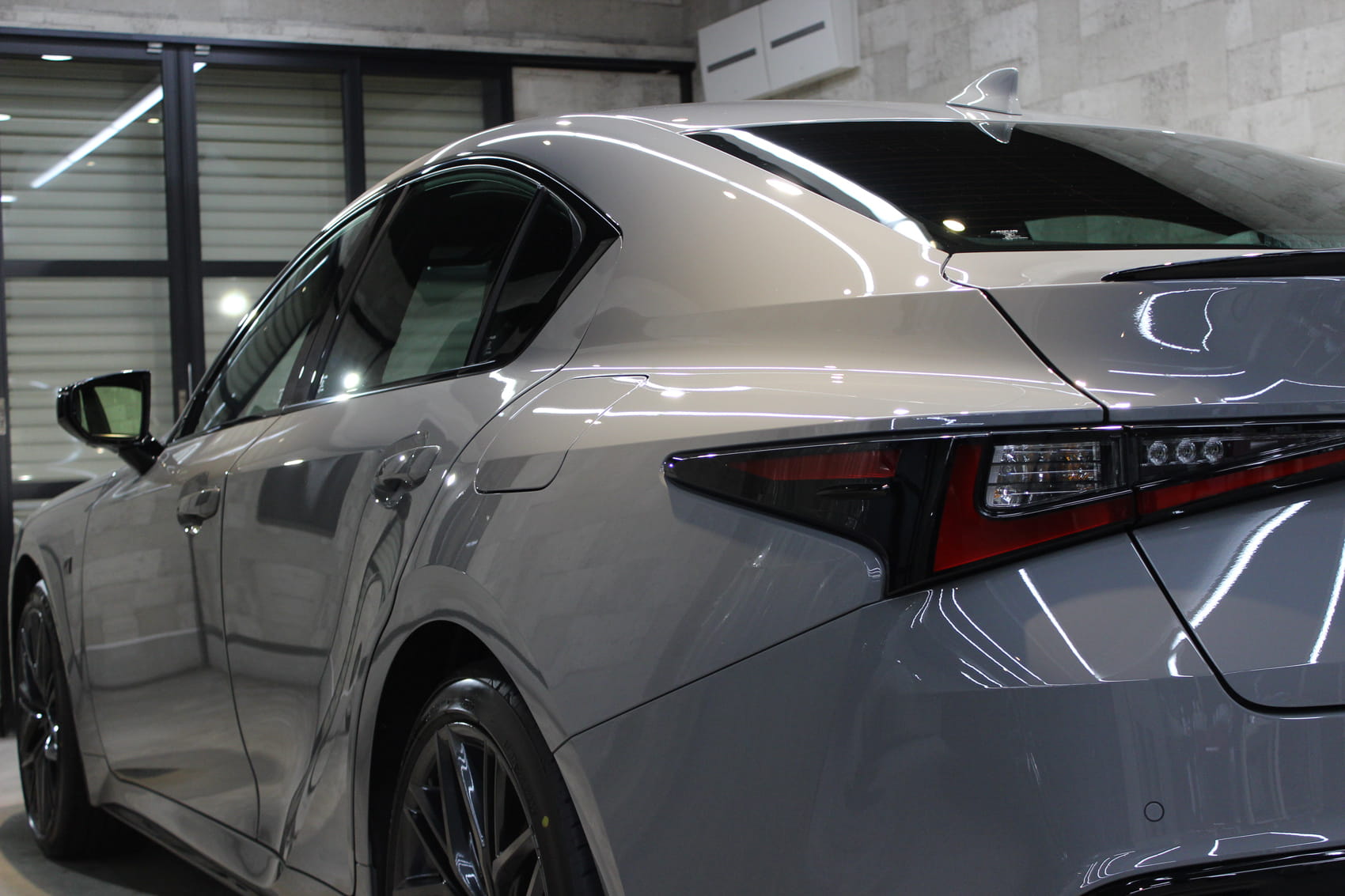 オーナー様には、以前にも他のお車のコーティングで当店をご利用いただいており、この度は新たに購入なさったIS 500にご依頼くださいました。塗装色はチタニウムカーバイドグレーというソリッドのグレーで、このカラーもまたISによく似合います。ただその一方で、ソリッドはメタリックに比べて塗装が繊細で柔らかめなケースがあり、また新車特有の塗装の曇りも多めという傾向があります。今回のISの塗装は、曇りはそこまで多くはなかったものの、レクサスの中では繊細な塗装でしたので、この性質を踏まえながらポリッシングを行いました。
